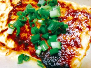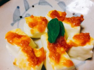 お豆腐に塗ろうと思っていたけど、とりやめ。前に同じく夫が九州から仕入れてきた、明太子マヨネーズを塗って焼いてみました。