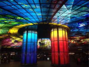 メダルを握りしめ、改札らしきところにダッシュ! 改札脇のガラス窓のボックスには駅員さんのような人もいるみたいだし、きっとなんとかなる。