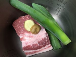 はじめに、豚肉、生姜、ネギを水から煮るのですが、我が家では電気圧力鍋を使っています。(300gのお肉を、可変圧力というモードで35分)