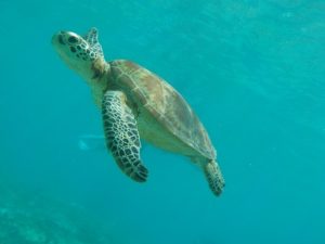 とかしくビーチで、ウミガメくんと泳ぐ。ニモちゃんファミリーだらけの良スポット。