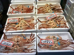 市場のあちこちに、所せましと蟹が並んでおり、今回の大目的「蟹を食べる!」という欲望が触発されまくりますが、